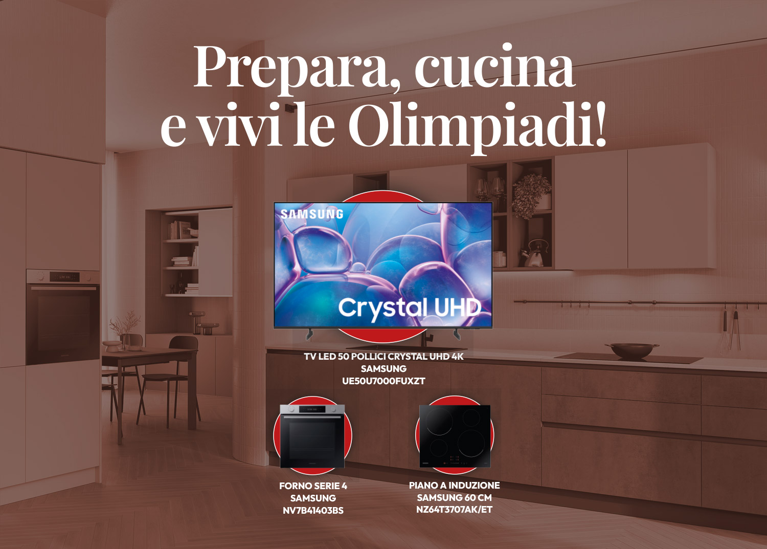 Acquista una cucina Scavolini del valore minimo di 6.000 € completa del Set Samsung (frigorifero e lavastoviglie) e il piano cottura Samsung NZ64T3707AK/ET, il forno Samsung NV7B41403BS e la TV Samnsung UE50U7000FUXZT sono compresi nel prezzo*.